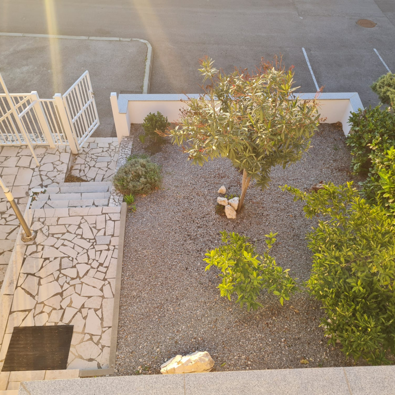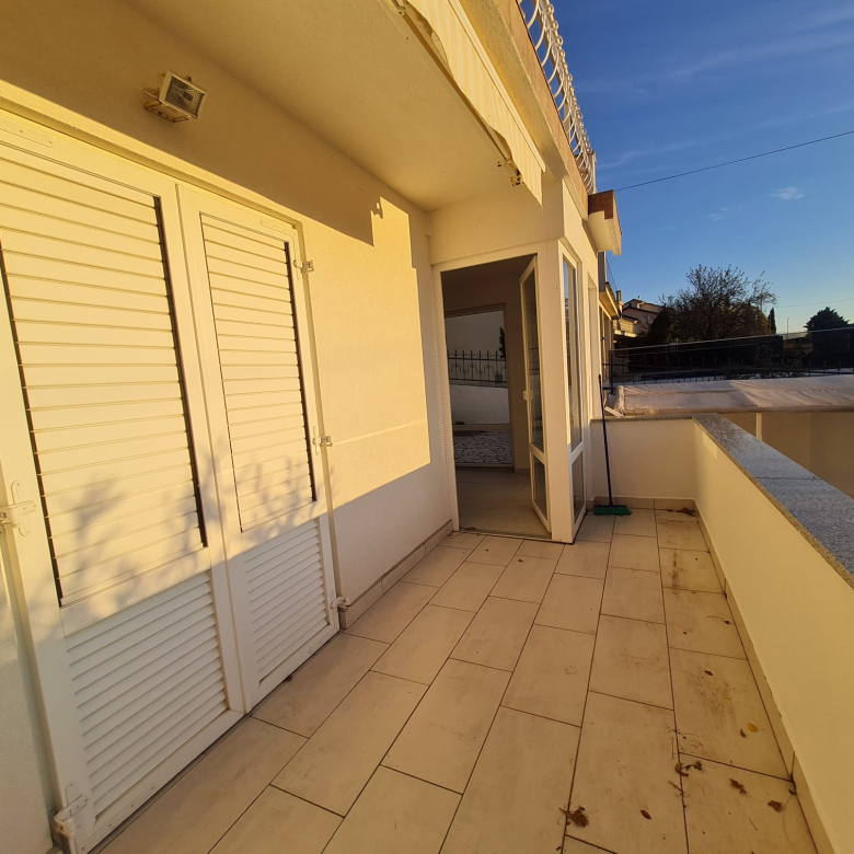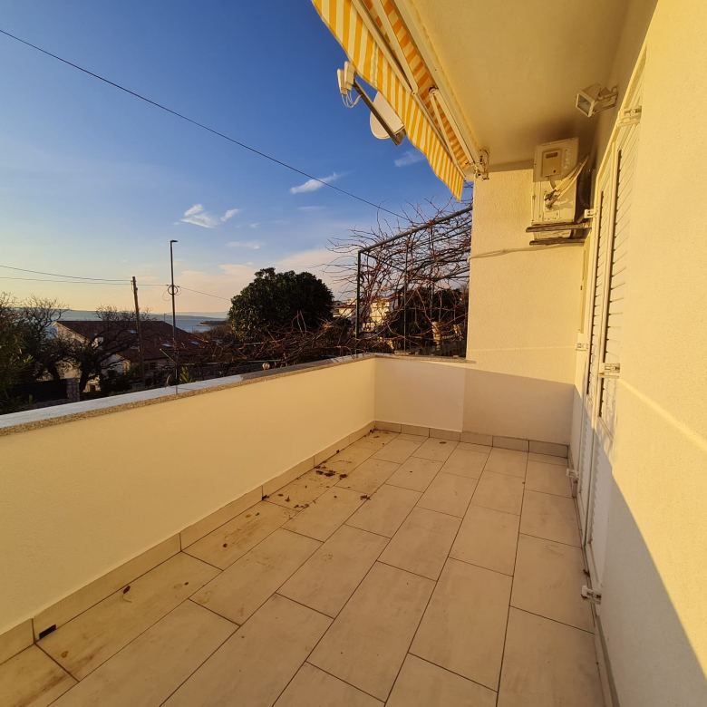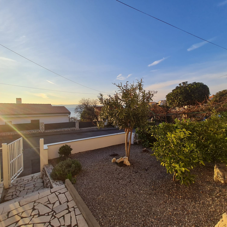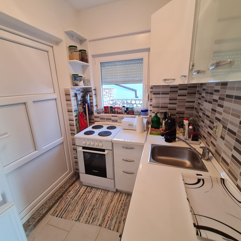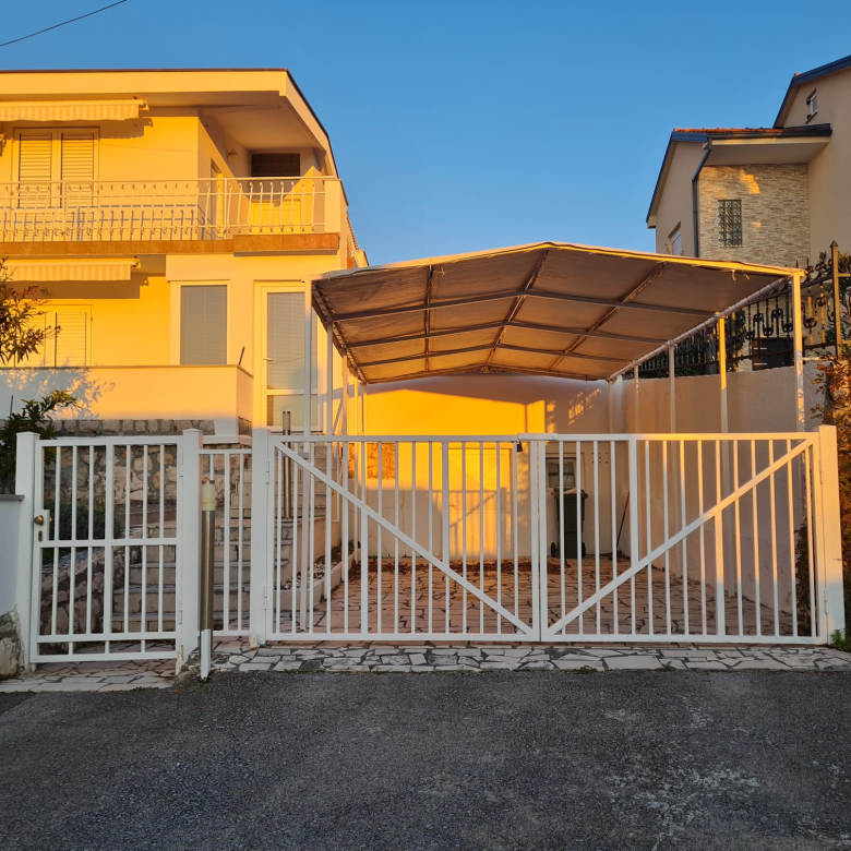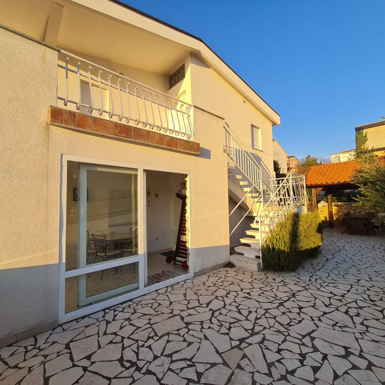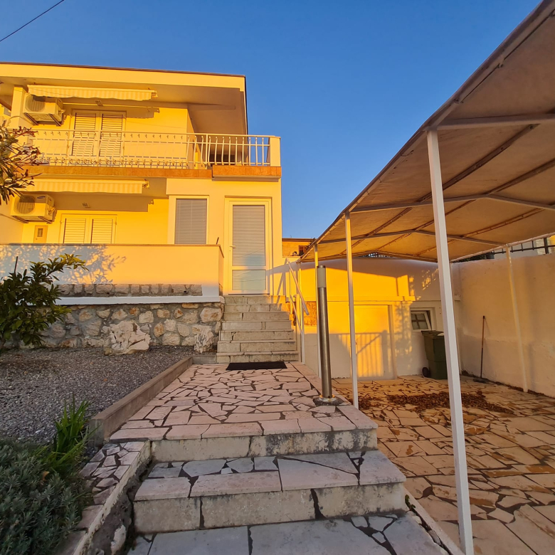 Novi Vinodolskiban eladó egy 100 m²-es ház, amely két szintből áll, és külső lépcső köti össze őket.